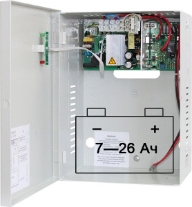 Резервный источник питания (устройство заряда аккумуляторных батарей), входное напряжение 170...250 В, выходное напряжение 9,5...14 В, суммарный выходной ток при наличии основного питания не более 5 А, суммарный выходной ток при отсутствии основного питания не более 20 А, под аккумулятор 12 В 17(26) Ач, световая индикация режимов работы, диагностические выходы типа "сухой контакт", защита от короткого замыкания, защита аккумулятора от глубокого разряда, диапазон рабочих температур -10...+40°С, габаритные размеры 295х215х158 мм